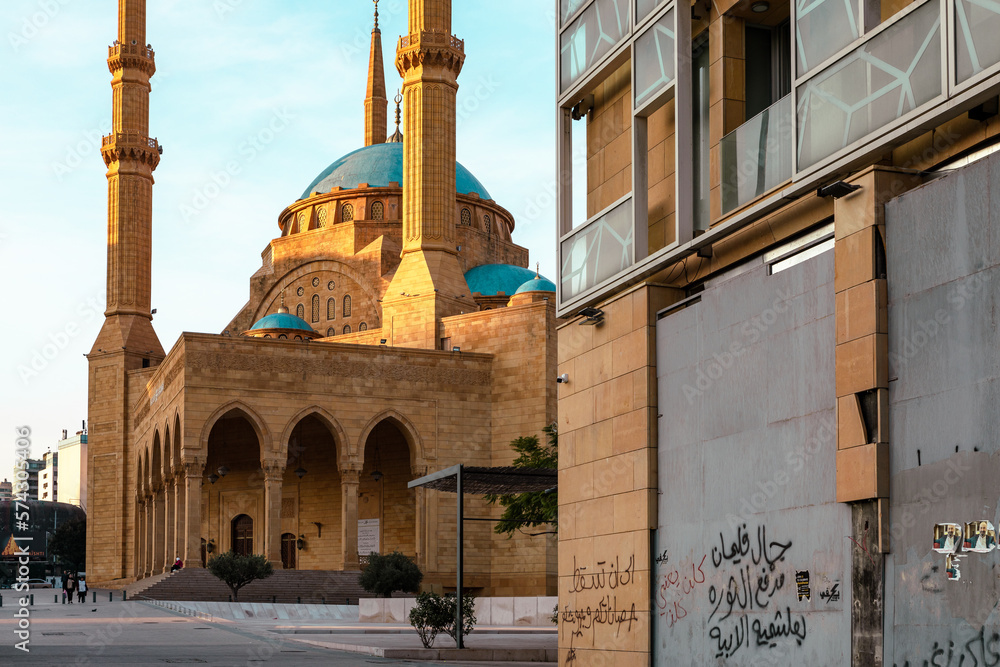 Mohammad Al-Amin Mosque and Saint George Greek ortodox church in the background in the center of Beirut, Lebanon.