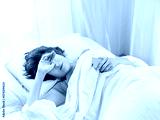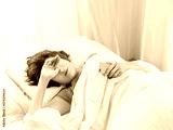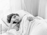 Sleepy woman is lying in bed, completely covered with white blanket. Smartphone used as alarm clock. It's hard to wake up early in morning. Woman does not get enough sleep.