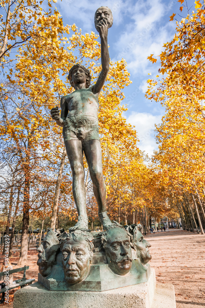 The Mask Seller statue by Zacharie Astruc in the Luxembourg garden in Paris, France in Autumn