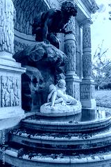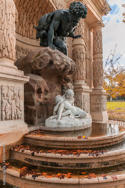 "Polyphemus Surprising Acis and Galatea" by Auguste Ottin, a sculpture of the Medici Fountain in the Jardin du Luxembourg garden in Paris, France in Autumn