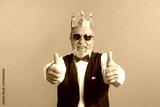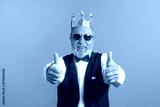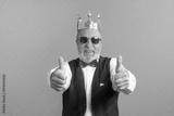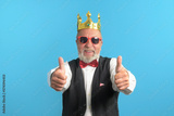 Funny old man in a festive suit on a blue background with a bow tie and a golden crown on his head