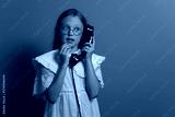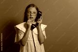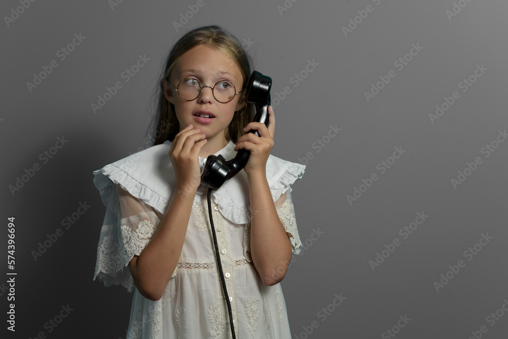 Portrait of a teenage girl with a phone. Communication in the past. retro. old phone. Gray background.