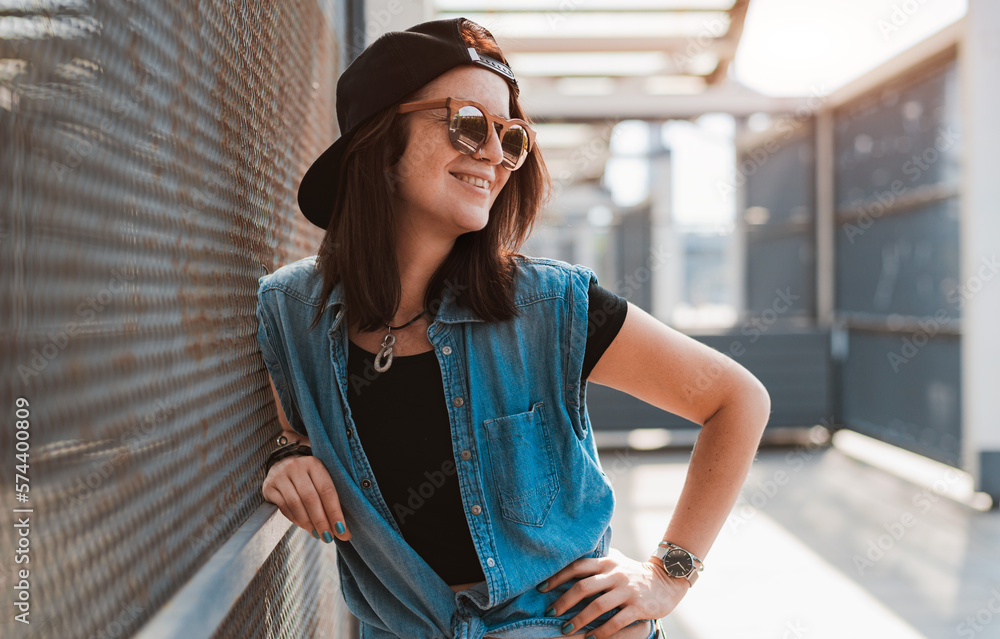 young stylish hipster girl in a daring image in a cap and sunglasses poses in the city in the rays of the sunset on an urban background.