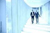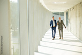 Young and a senior businessman walk down an office hallway, deep in conversation