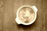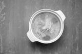 bowl of chicken broth with chicken and carrot in ceramic