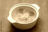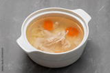 bowl of chicken broth with chicken and carrot in ceramic