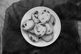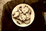 Mini round toasts of bread with raisins on dish