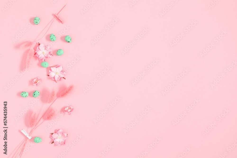 Easter decor, composition. Flowers, easter eggs on pastel pink background. Flat lay, top view, copy space