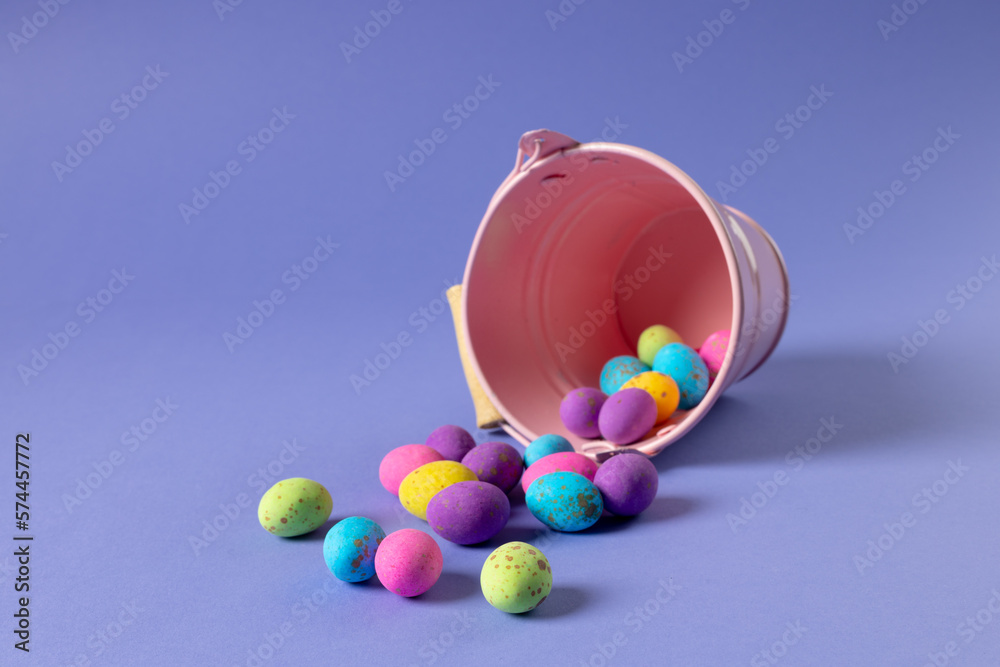 Image of multi coloured easter eggs and bucket with copy space on purple background