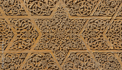 Fragment of an ancient carved wooden door. Ornate.