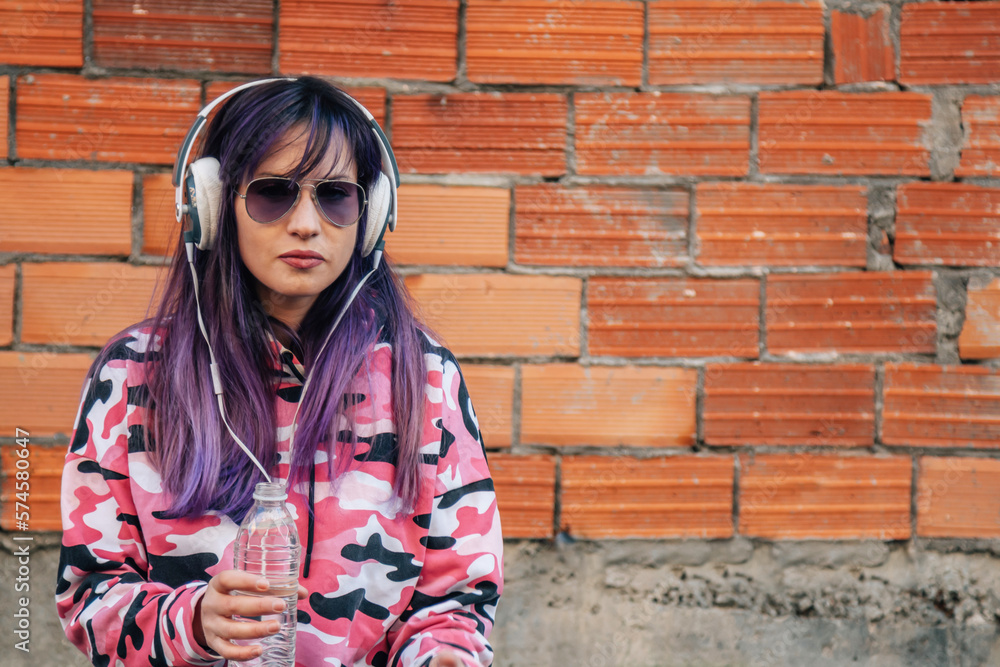 woman wearing sportswear with earphones and bottle of water in the street