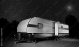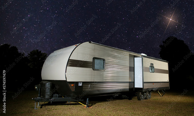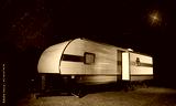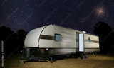Bright light in the night sky above a trailer