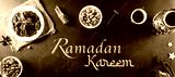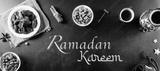 Ramadan Kareem background concept, Rosary bead with dates fruit and milk on dark stone background.