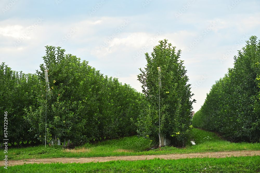 rows of apple trees in an apple orchard on a background of green grass and sky.