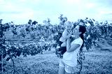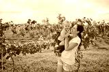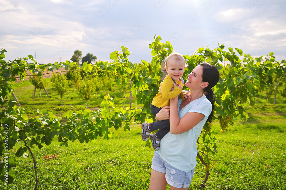 mom holds a baby in her arms and smiles at him against the background of a grape orchard and sunlight.