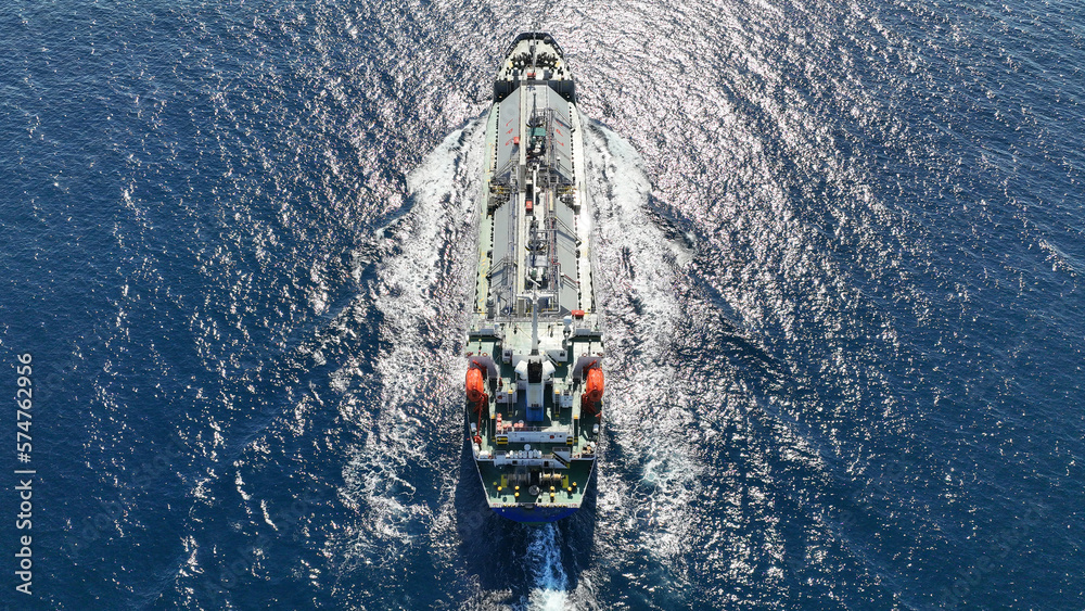 Aerial drone photo of LPG or Liquified Petroleum Gas tanker cruising deep blue Mediterranean sea