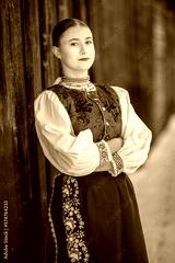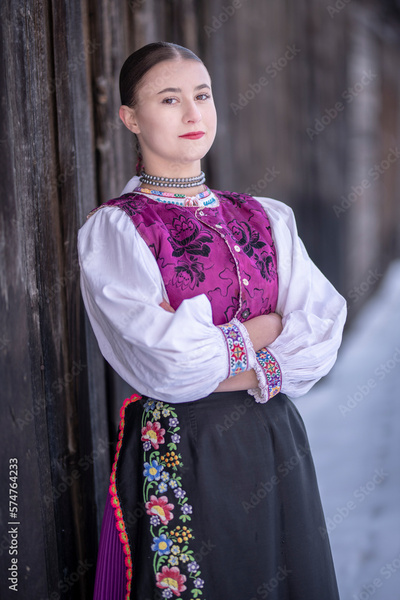 Young beautiful slovak woman in traditional costume. Slovak folklore