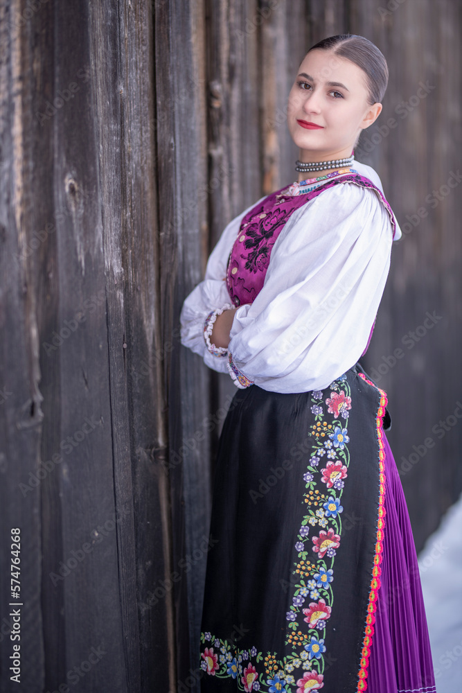 Young beautiful slovak woman in traditional costume. Slovak folklore