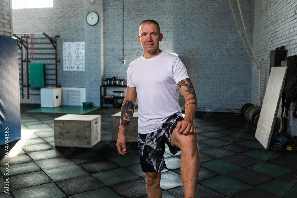Athletic man in white t-shirt in crossfit gym. Mock-up.