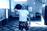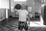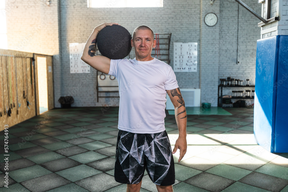 Man in white t-shirts in a crossfit gym. Mock-up.