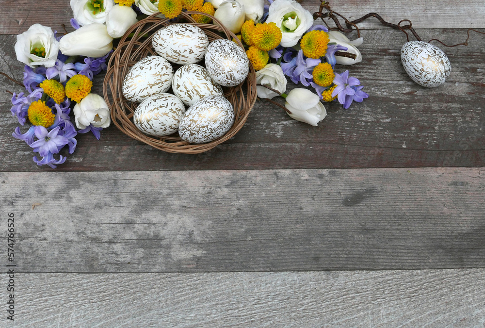 Ein Korb mit Ostereiern auf braunem Holzhintergrund.