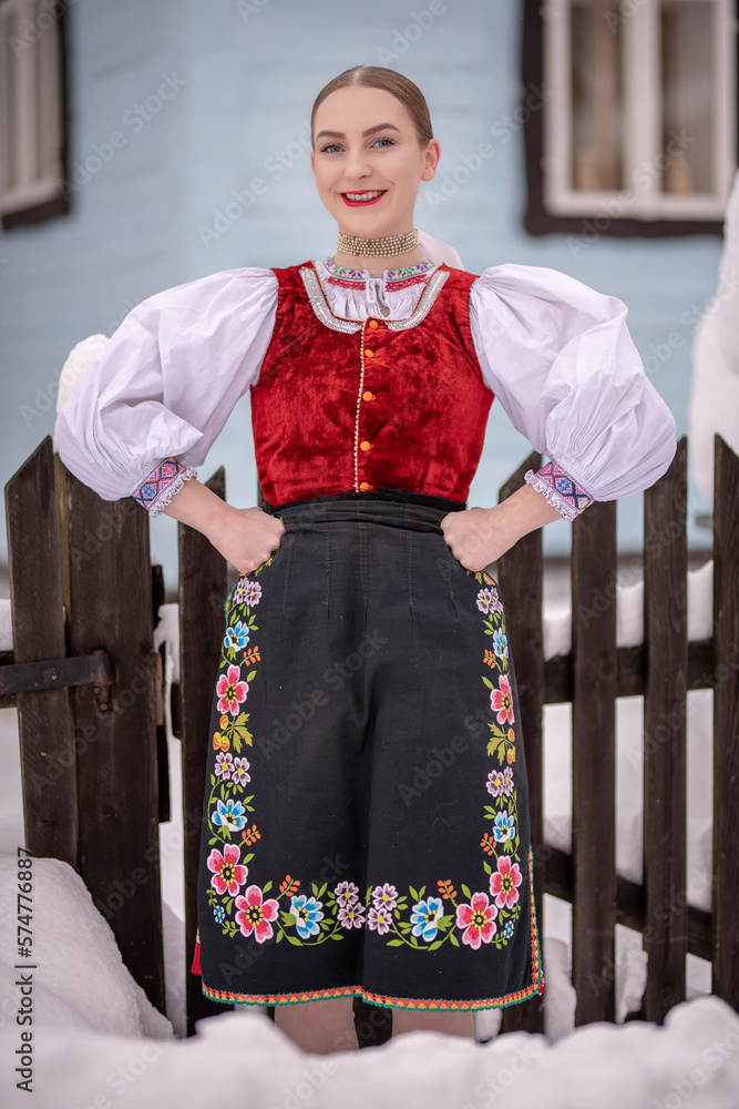 Young beautiful slovak woman in traditional costume. Slovak folklore