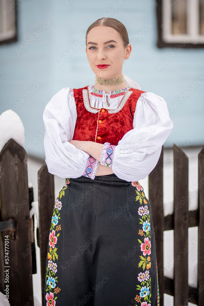 Young beautiful slovak woman in traditional costume. Slovak folklore