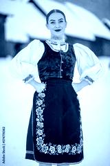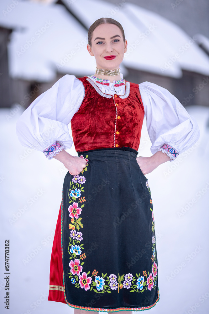 Young beautiful slovak woman in traditional costume. Slovak folklore