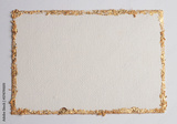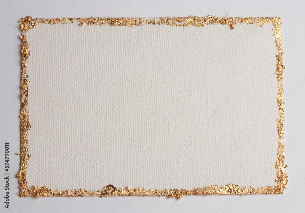 Gold (bronze) glitter empty canvas frame on beige gray paper background. Abstract copy space texture.