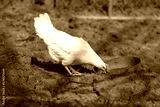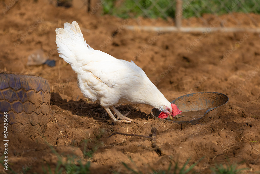 Leghorn hen. Poultry farm. Chicken broilers. White chicken drinking water in a farm garden.
