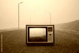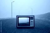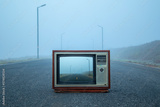 Retro classic old TV frame on asphalt road with fog in winter, close up, front view