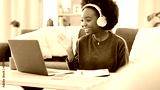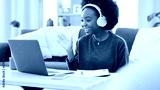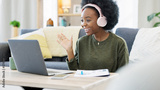 Woman talking on videocall using laptop and headphones while waving hello to friends online. Student making notes while communicating and learning new language during online course or private lesson