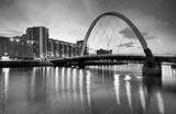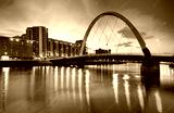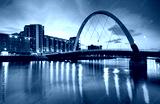 Beautiful Sunset Clyde Arc Bridge across river in Glasgow, Scotland, UK. It is nice weather with reflection on water, blue sky, lights from buildings in downtown, skyline, attractions.