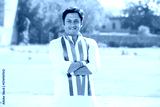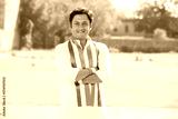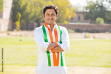 Portrait of young indian man wearing traditional white kurta and tricolor duppata standing cross arms at park. Election and politics, celebrating Independence day or Republic day.