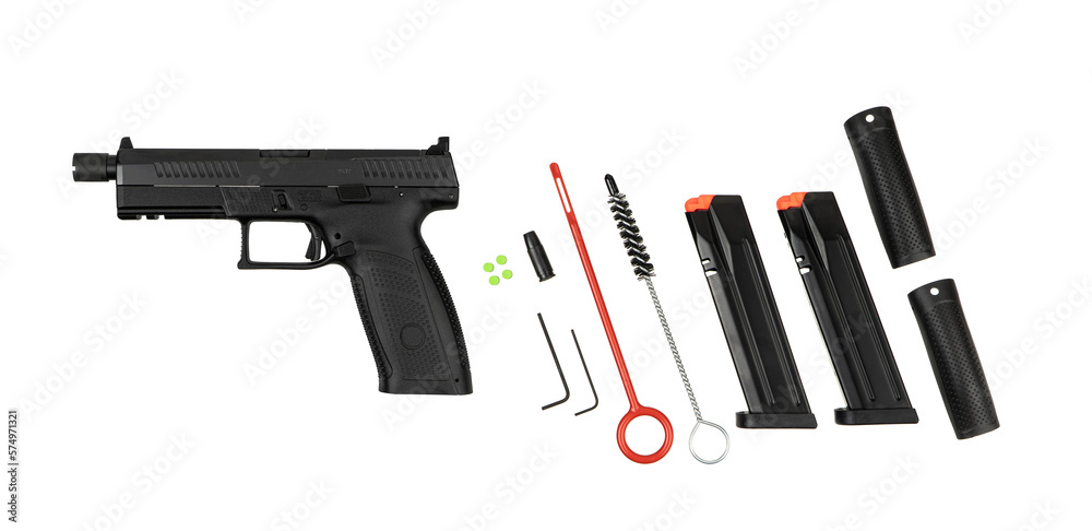 Modern semi-automatic pistol isolate on a white back. Armament for the army and police. Short-barreled weapon