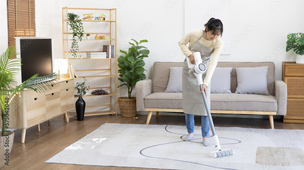 Beautiful woman vacuuming the floor and carpet in her living room, Big cleaning in the house, Removes germs, Housewife cleaning, Keeping her home clean, Domestic hygiene.