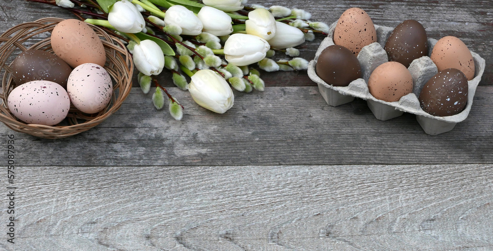 Blumenarrangement aus Tulpen und Weidenkätzchen mit braunen Ostereiern auf einem rustikalem Holz Hintergrund.