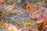 Multi-colored tangled threads background. Macro or close up of colorful tangled threads. Needlecraft silk thread ropes. Colored natural thread pile for sewing cloth scattered randomly like spaghetti.