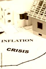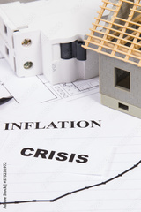 Inscriptions crisis and inflation with electric fuse, work tools, small house under construction and electrical installation plan. High prices of building or renovation home