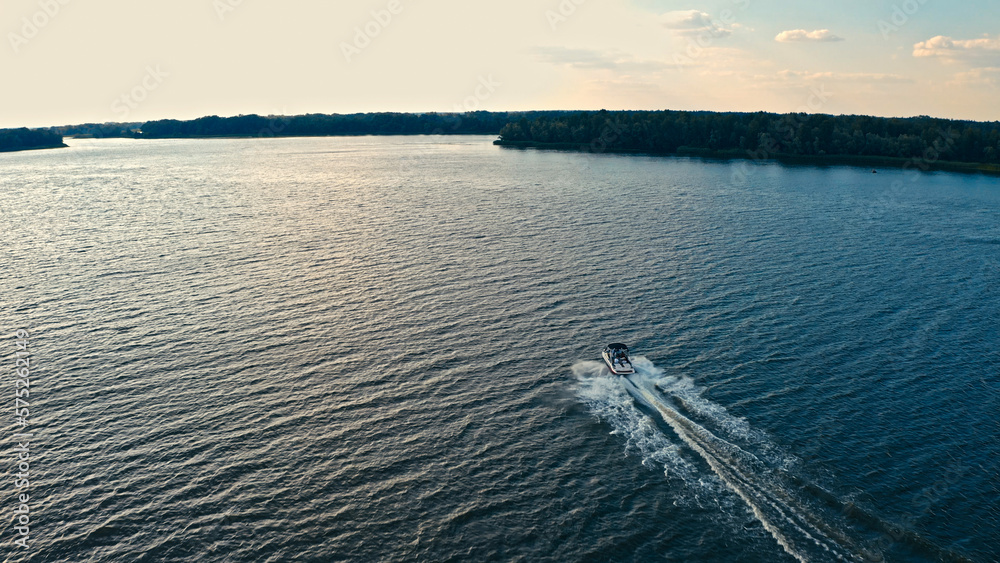 Photo from a drone above a river with a fast driving speedboat while sunset. Aerial view of driving powerboat on lake..