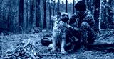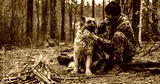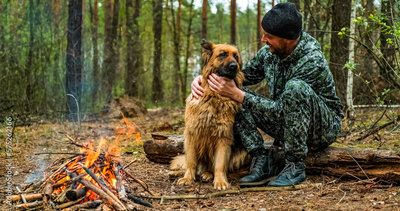 Man with big dog sits at the fire in the forest. Human looks at the fire and touching his dog in nature in autumn. Alone traveler is resting with his German shepherd by the forest fire.