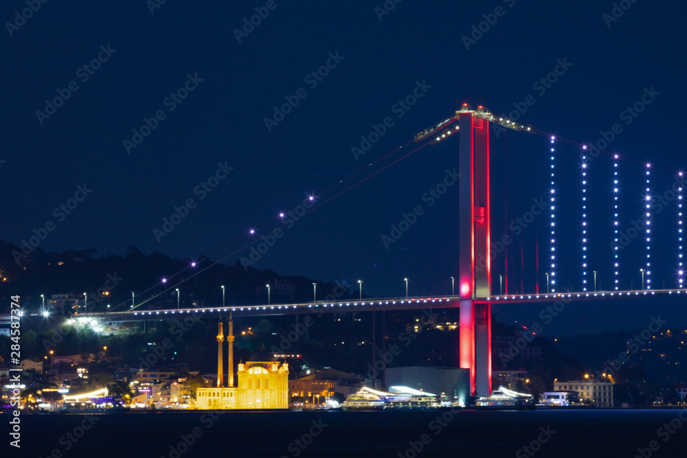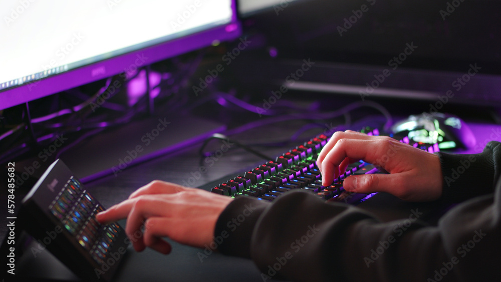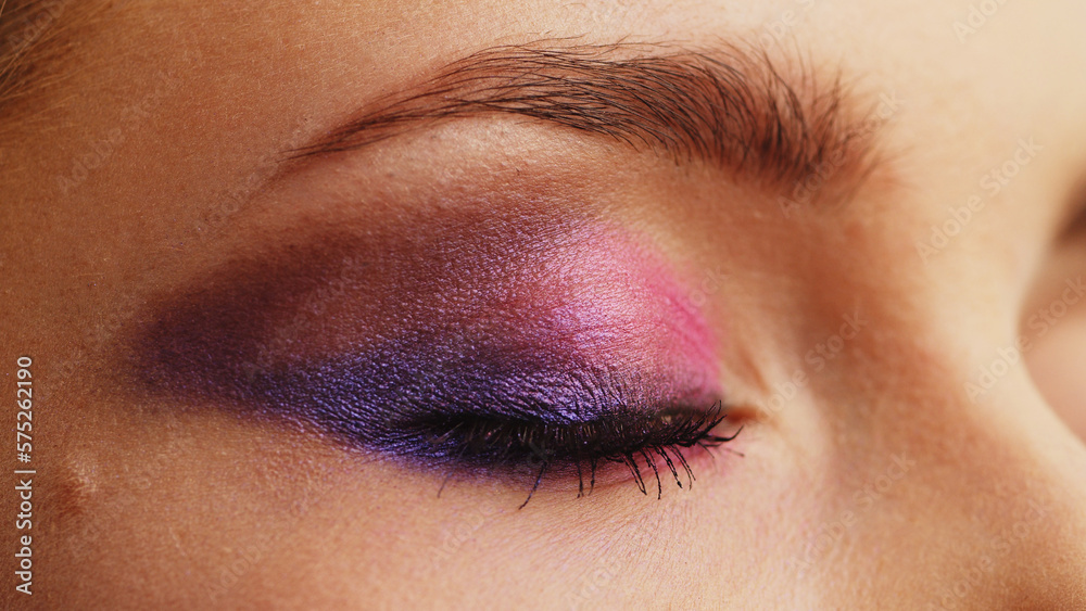 Close-up of a woman's eye with bright shiny makeup. The blinking eye of a girl in profile. Pink-purple sequined fashion makeup. Beauty fashion makeup.