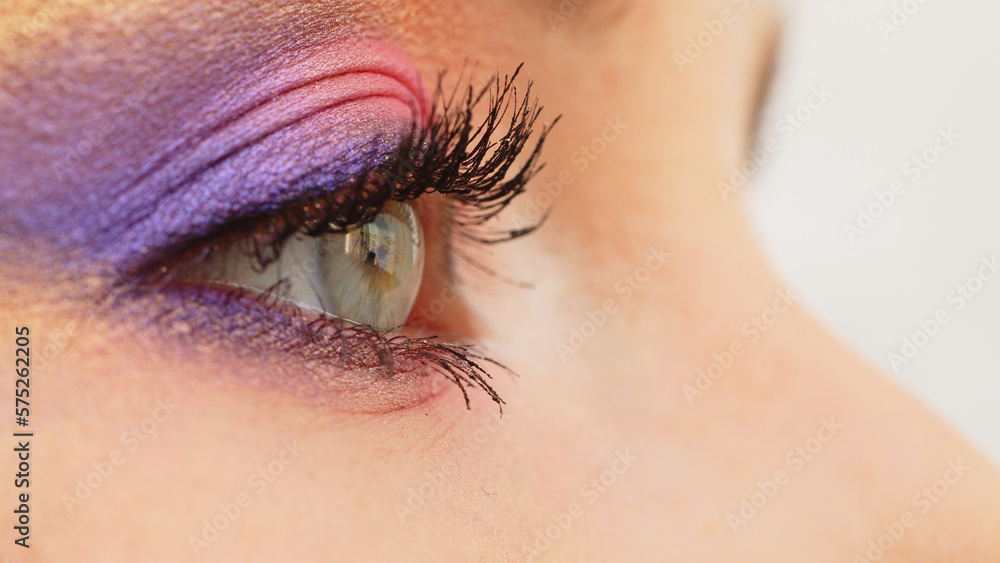 Close-up of a woman's eye with bright shiny makeup. The blinking eye of a girl in profile. Pink-purple sequined fashion makeup. Beauty fashion makeup.