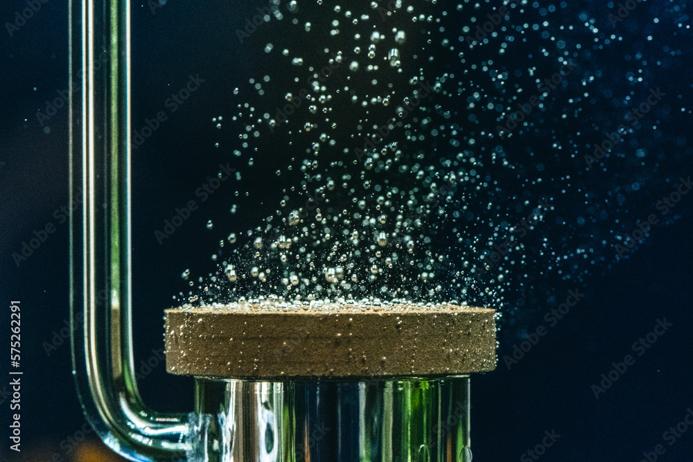 Oxygen diffuser under water pumping a lot of small bubbles. Oxygen under water. Bubbles under water, macro.
