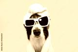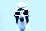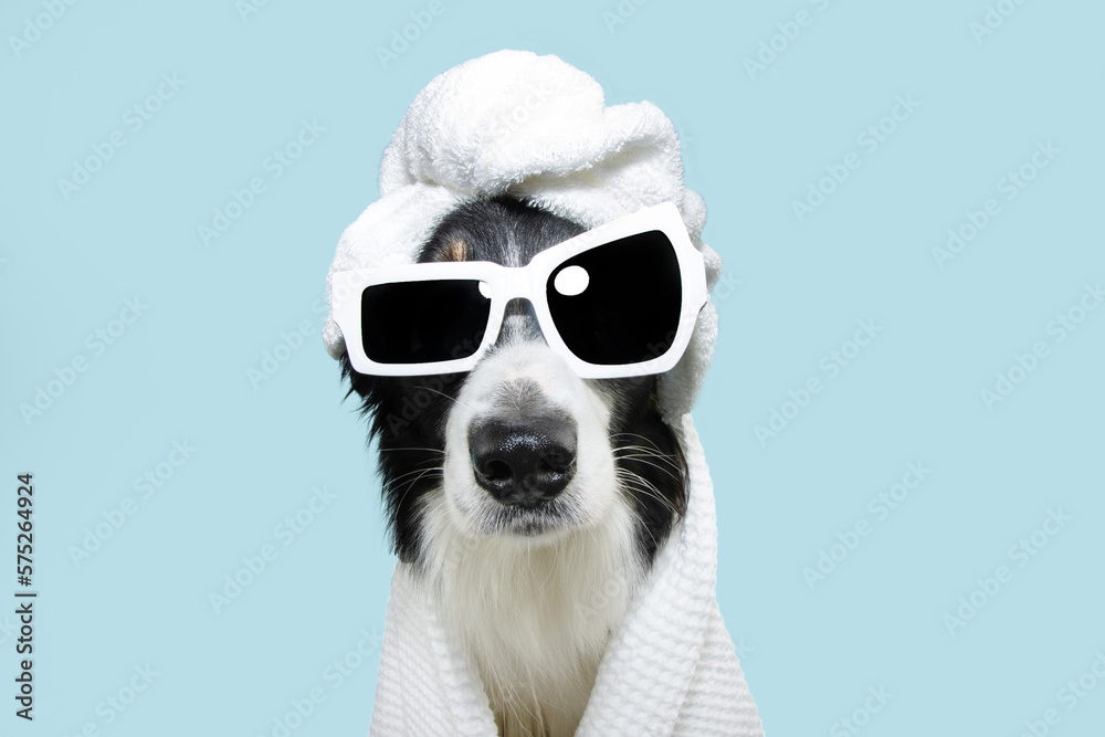 Border collie dog summer going on vacations. Puppy relaxing spa wrapped with a white towel and sunglasses. Isolated on blue pastel background.
