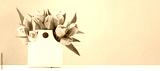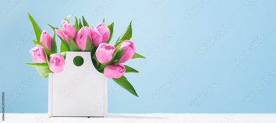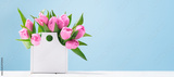 Bunch of tender pink tulips in white box on wooden table. Birthday gift. Valentines 8 March Womens or Mothers Day celebration greeting card or web floral banner. Spring garden