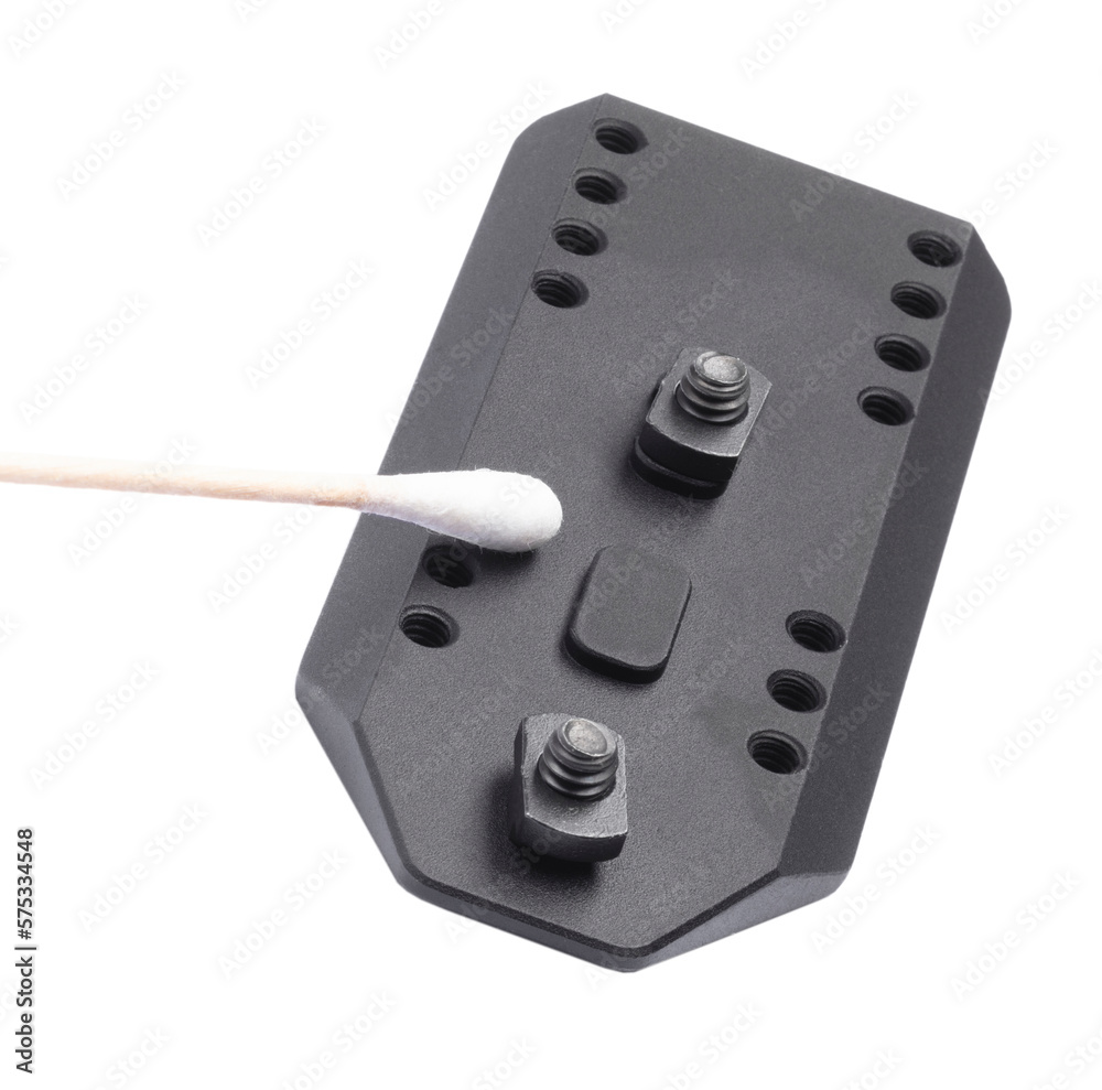 Cotton swab cleaning a bipot mounting plate for a rifle