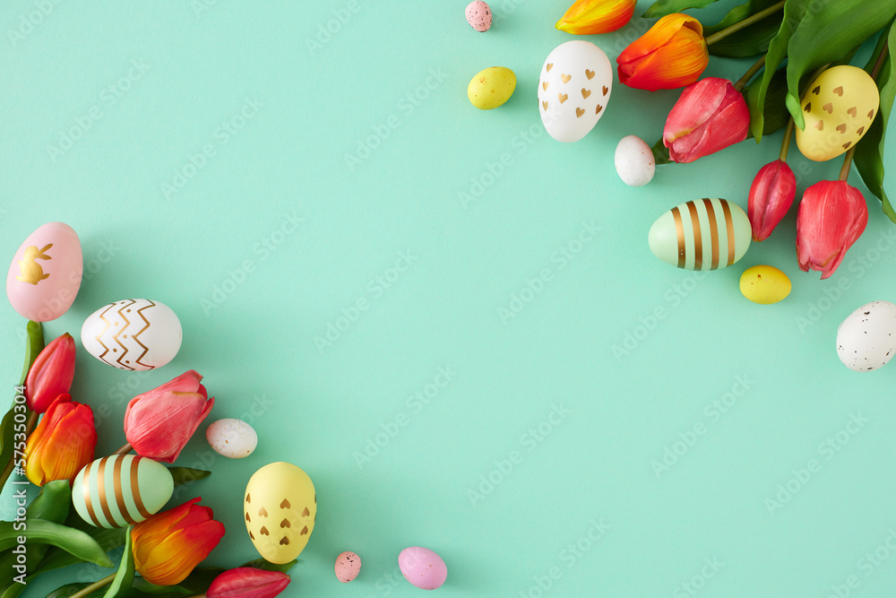 Easter celebration concept. Top view photo of red tulips flowers and colorful eggs on isolated teal background with empty space in the middle