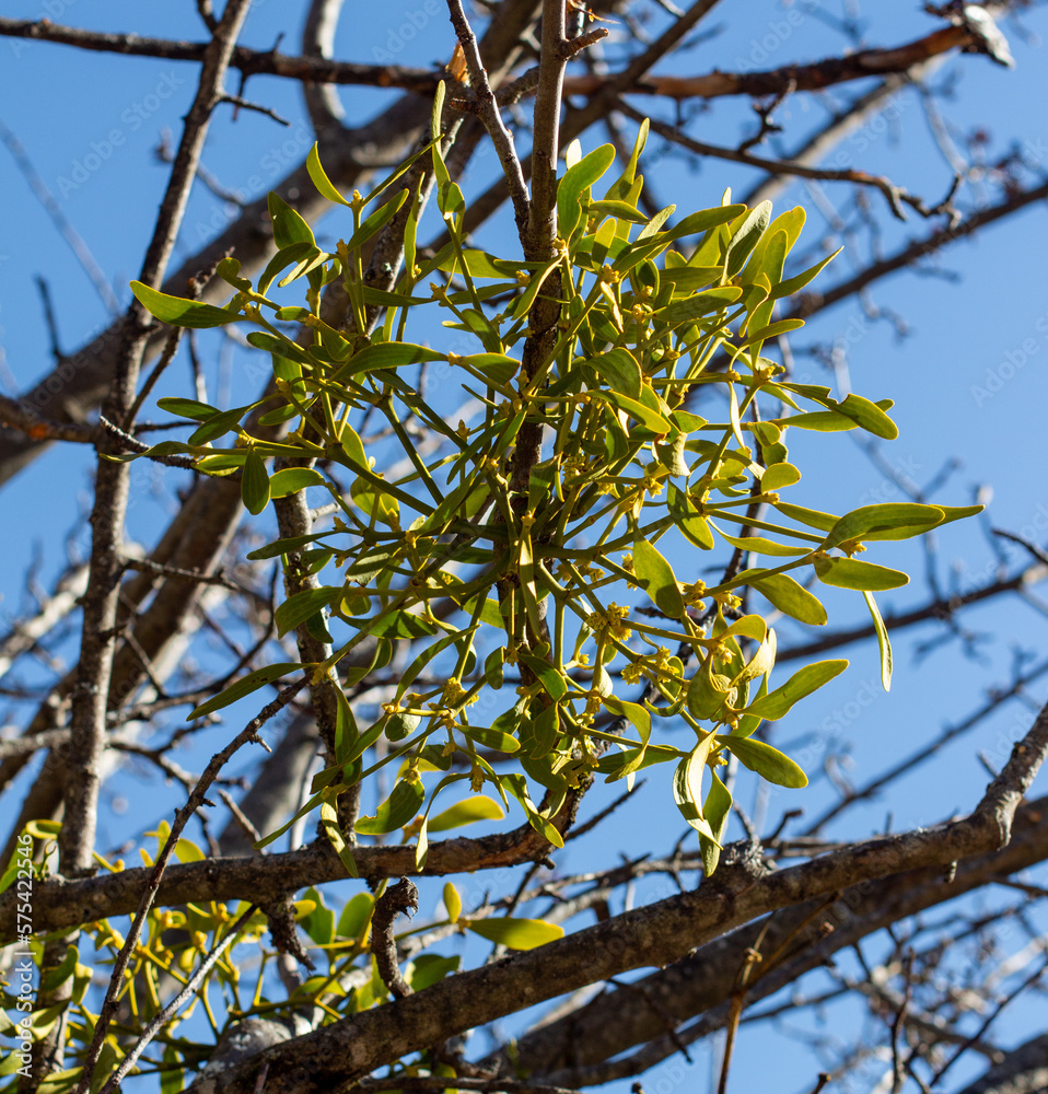 Viscum album, a species of mistletoe in the family Santalaceae, commonly known as European mistletoe, common mistletoe or simply as mistletoe. La Robine sur Galabre, Alpes de Haute Provence, France.