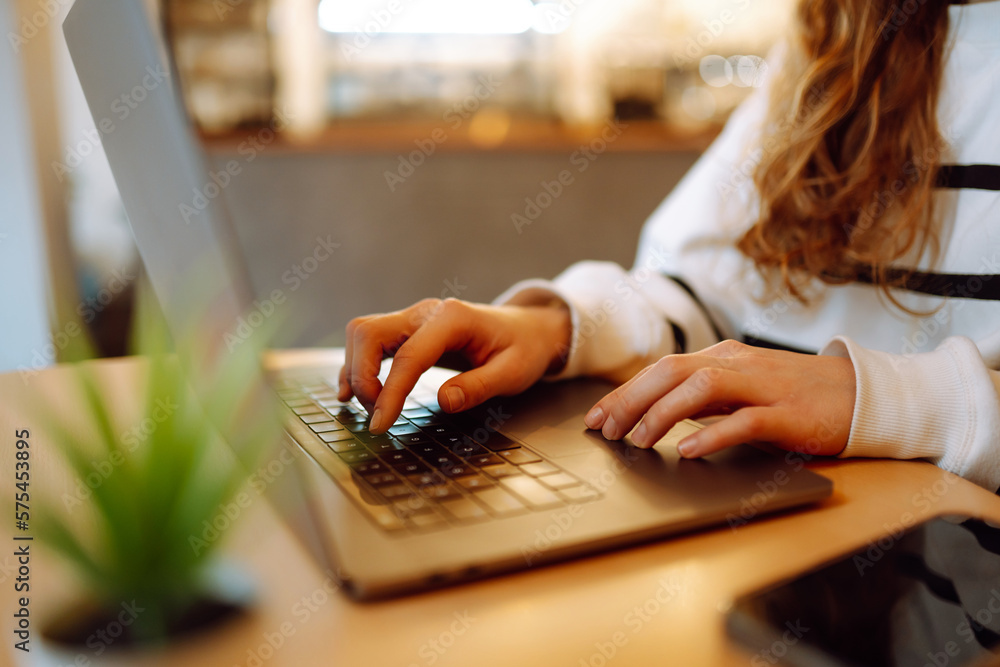 Female hands working on a laptop, close-up. , Freelance, online course, remote work and lifestyle concept. Online shopping with laptop